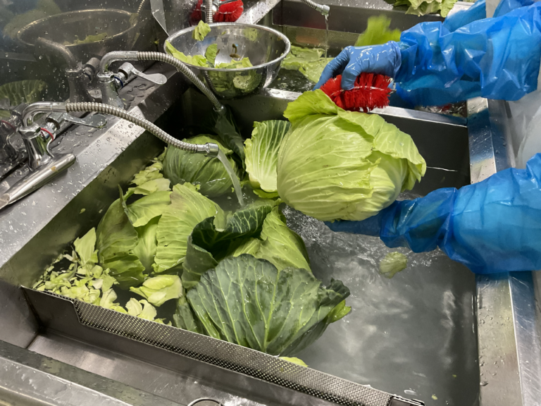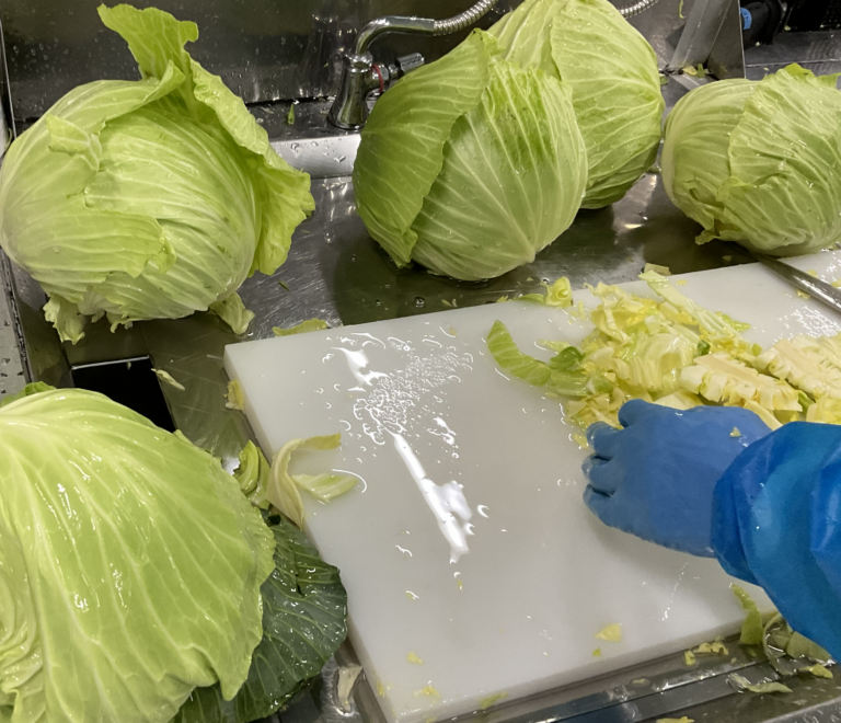 量をこなさなければならない中で、手際よくキャベツを切り続ける。